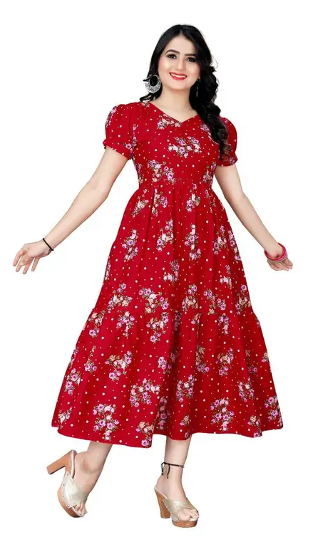 Women's Floral Print Crepe Stitched Flared/A-line Gown (Red) (Size L)