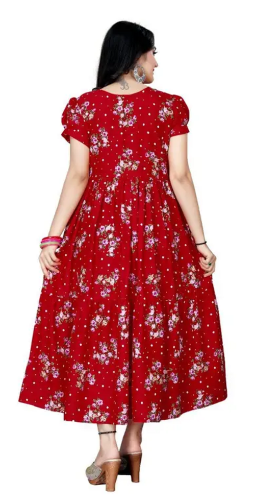 Women's Floral Print Crepe Stitched Flared/A-line Gown (Red) (Size XL)