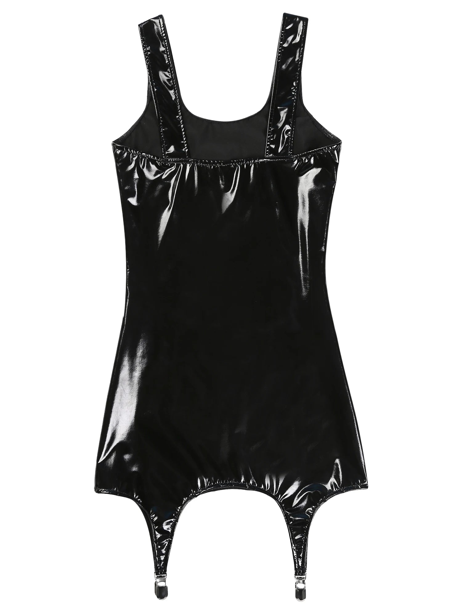 Women's Latex Garter Belt Bodycon Mini Dresses Wet Look Patent Leather Sleeveless Tank Dress Rave Party Nightclub wear Wide Shoulder Strap Mini Dress with Metal Clips
