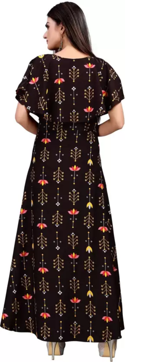 Women's Printed Crepe Stitched Anarkali Gown (Brown) (Size L)