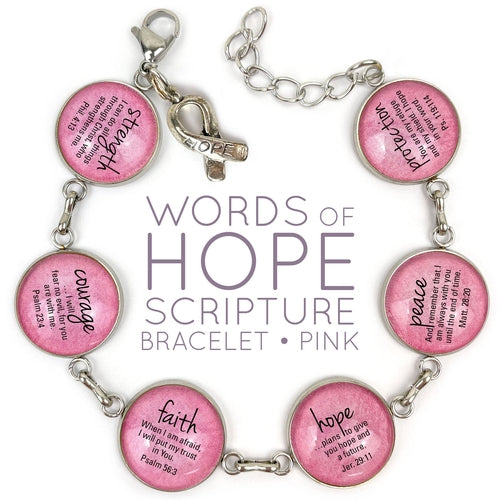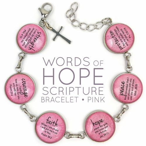 This beautiful charm bracelet features six encouraging words and its corresponding Scripture verse, magnified under six glass charms on your choice of a pink or a neutral-colored background: