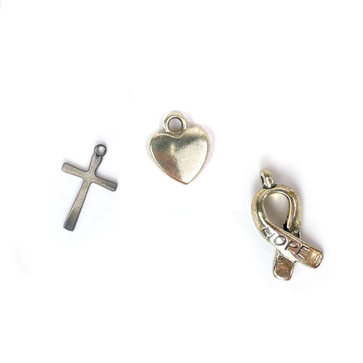 Choose a dangling charm – a ribbon charm featuring the word “Hope,” a cross charm, or a heart charm.